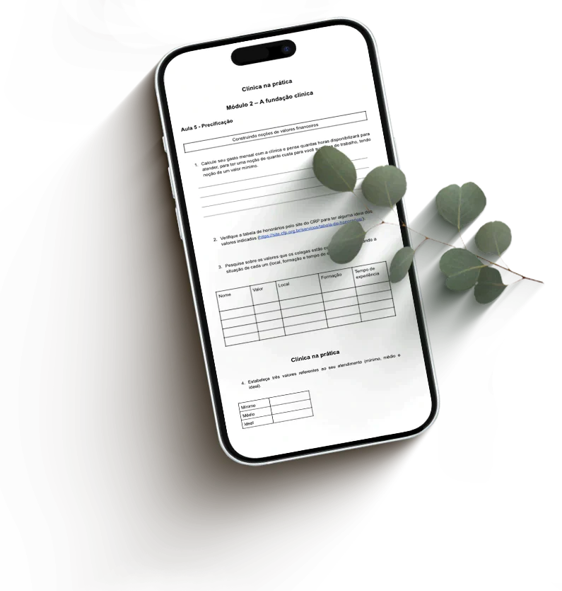 Você terá exercícios específicos para colocar sua clínica em construção, facilitando a definição de objetivos, a organização dos dados importantes e a execução das tarefas necessárias de forma clara e eficiente.